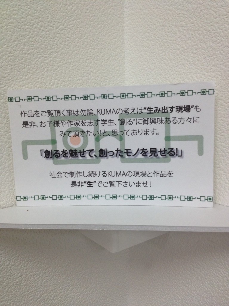 先ずは、弊社のご紹介を兼ねまして「KUMAの創っているモノ展」開催中です。