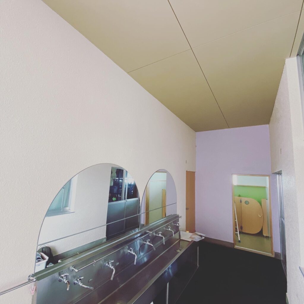 「廊下を明るくしたい!」照明機器を取り付けることも検討されている中で、トイレに繋がる廊下であるために、子どもたちのためにも明るく元気な廊下にしたいとのご意向とご相談でした。